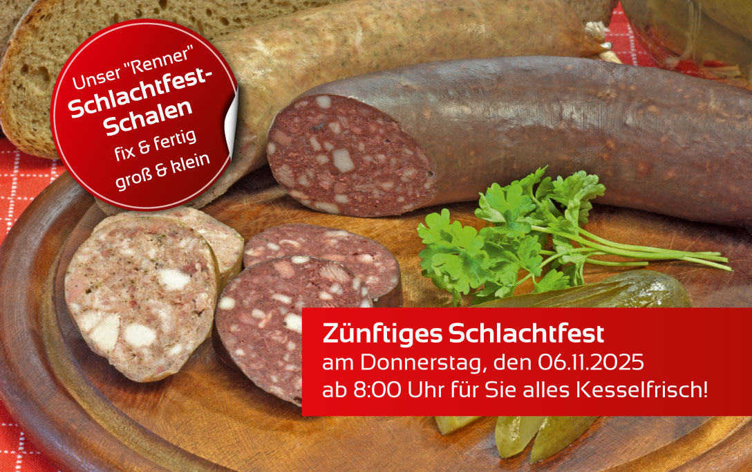 Am Donnerstag, den 06.11.2025 bieten wir Ihnen in unserer Fleischerei ein zünftiges Schlachtfest!
